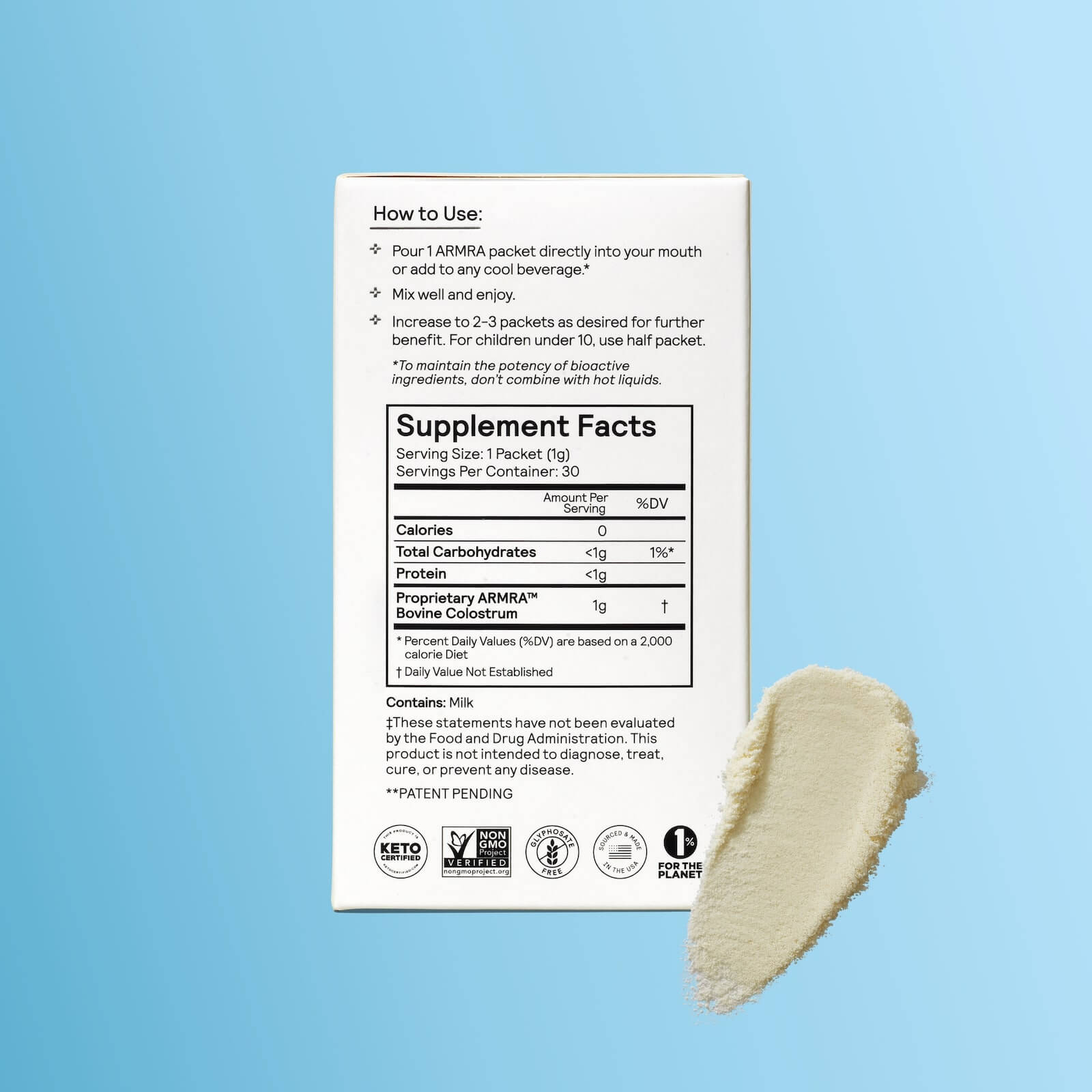 ARMRA Colostrum™ harnesses nature's 300 million-year-old bioactive food, colostrum, to naturally rebuild and strengthen mucosal barriers throughout your body. It is the first whole food that targets the root cause of today’s common health issues.